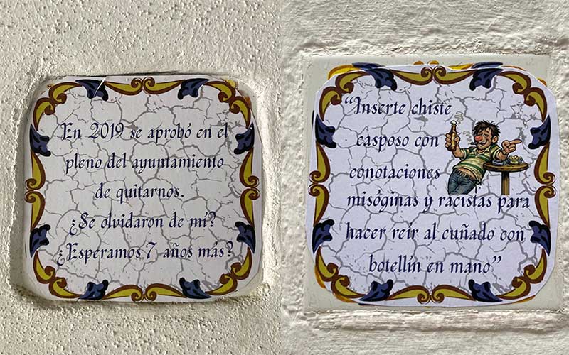 Al respecto, estos activistas anónimos recuerdan que han pasado ya siete años desde que en 2019 el pleno del Ayuntamiento aprobó la retirada de estos azulejos, después de que distintos colectivos feministas denunciaran su contenido discriminatorio: “a día de hoy varios de ellos continúan en las paredes del callejón, a pesar del acuerdo adoptado”.