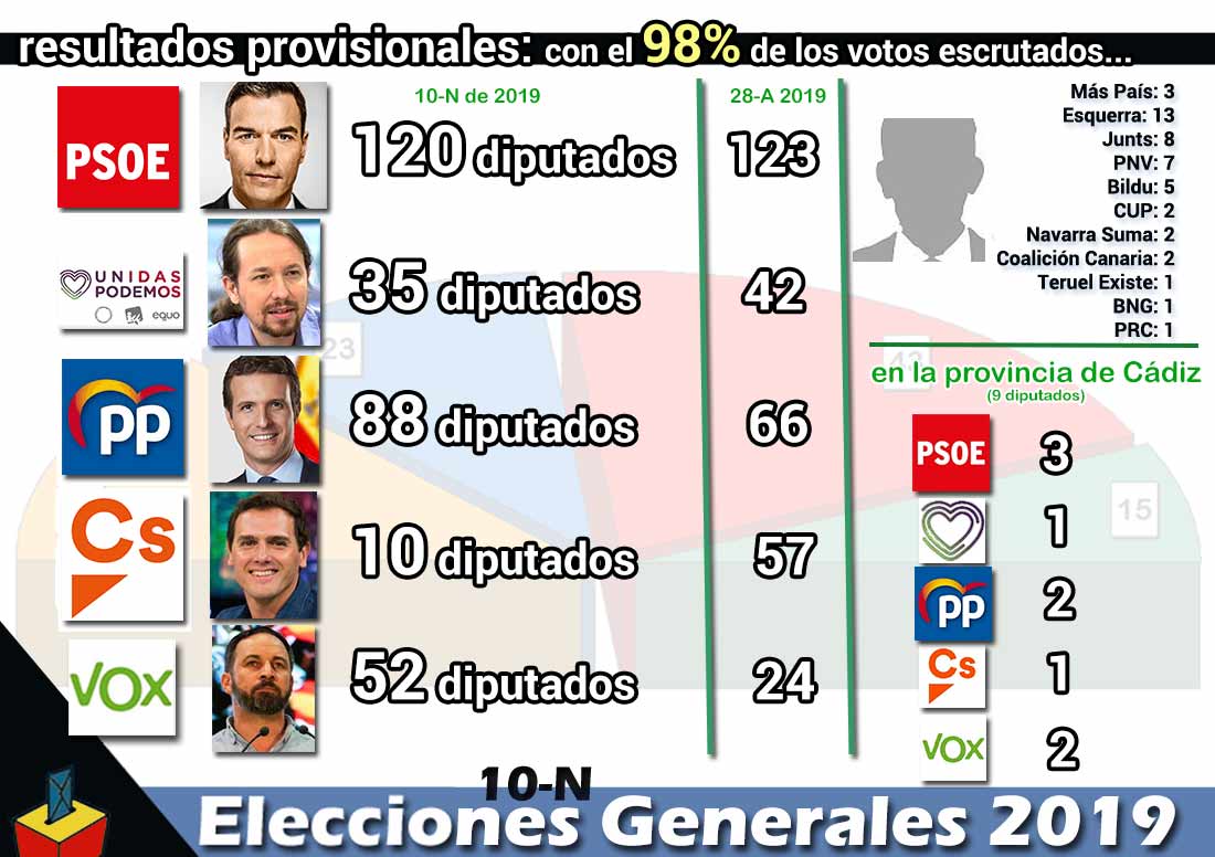 A nivel provincial, en Cádiz se reparten nueve escaños a la Cámara Baja. Al 98% del escrutinio de este 10-N, el PSOE suma 3 diputados (y el 30,61% de votos); Vox obtiene 2 (21,34%); el PP, 2 (18,05% del total); Unidas Podemos, 1 (el 15,09% de sufragios); y Ciudadanos pasa de segunda fuerza a quinta con 1 (9,00%).